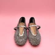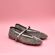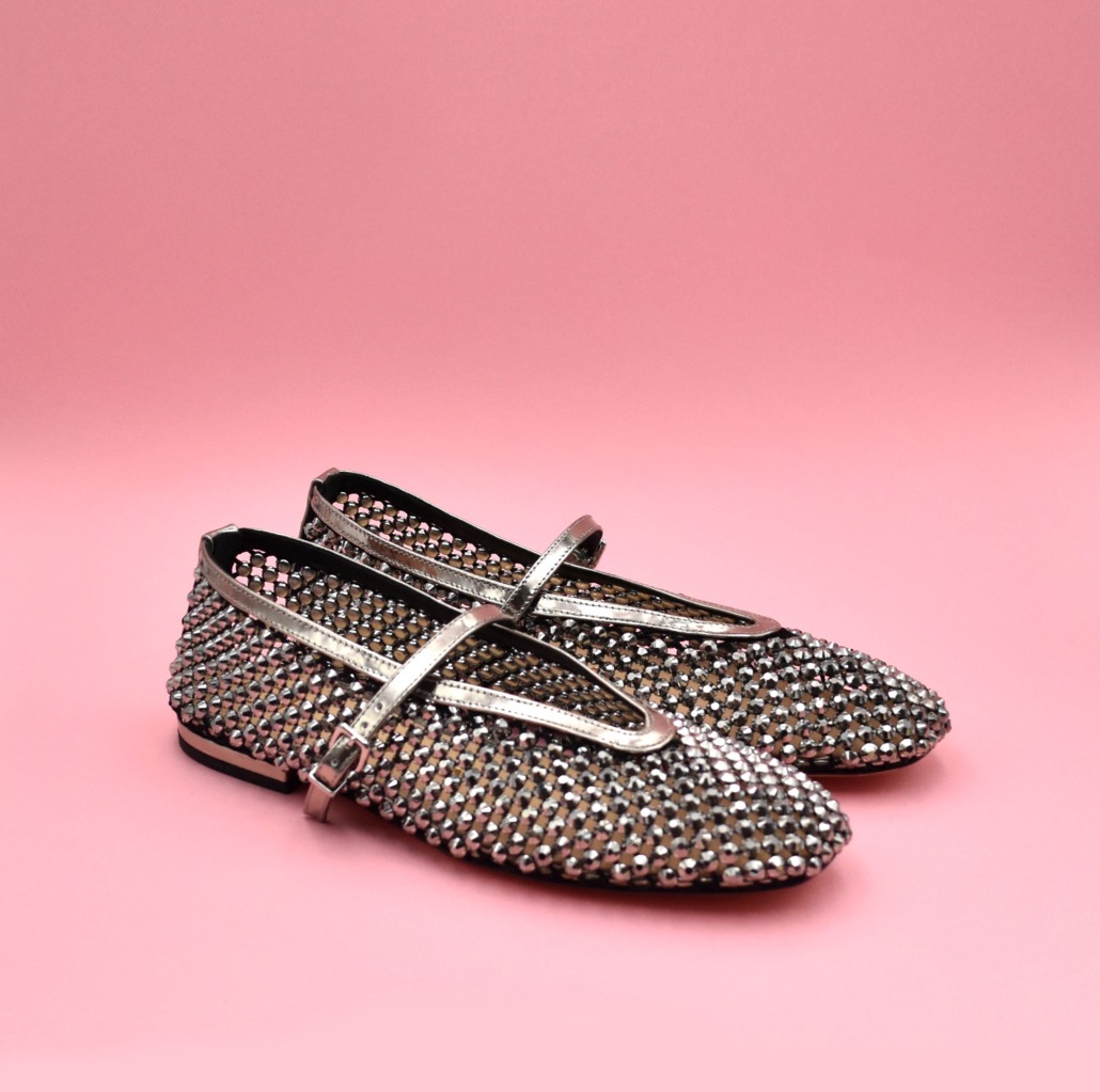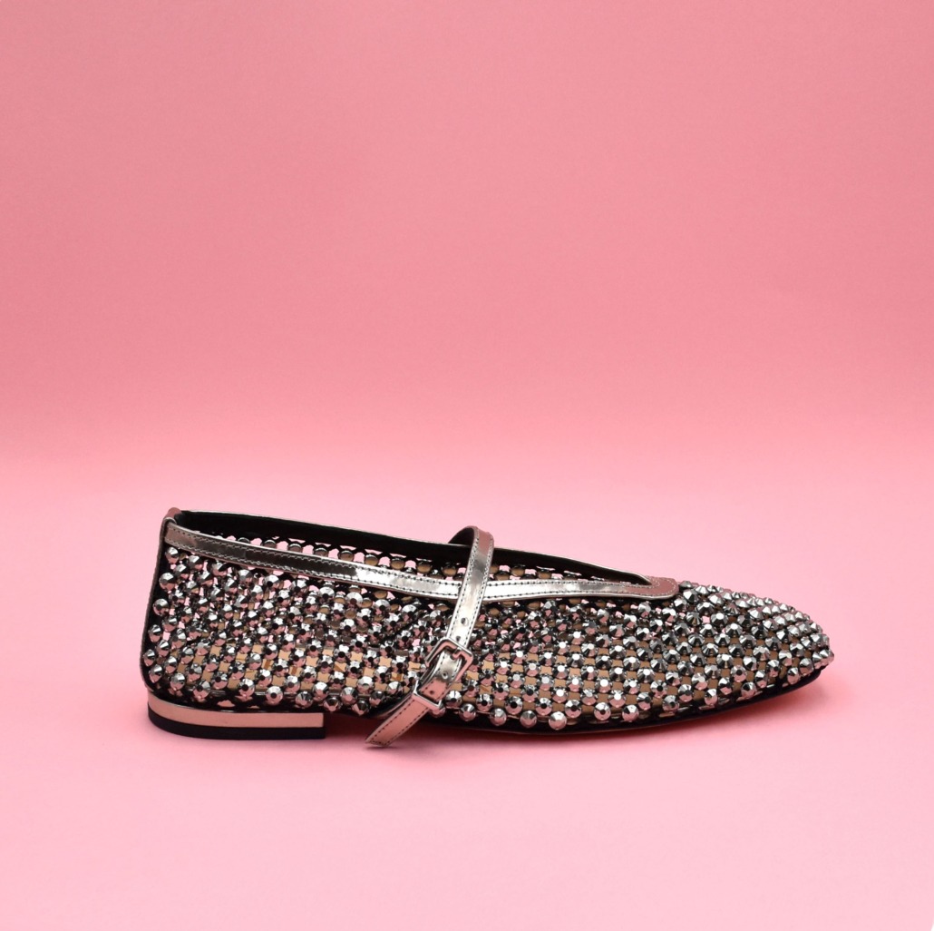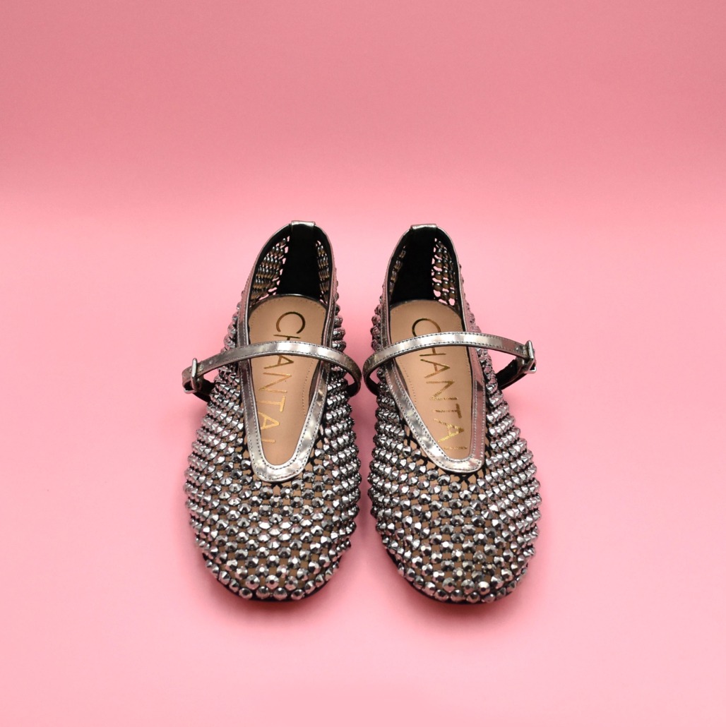 Preziosa ballerina gioiello firmata Chantal realizzata in morbida maglia con pietre specchiate antracite, scollo a V avvolgente e cinturino su collo piede con fibbia.