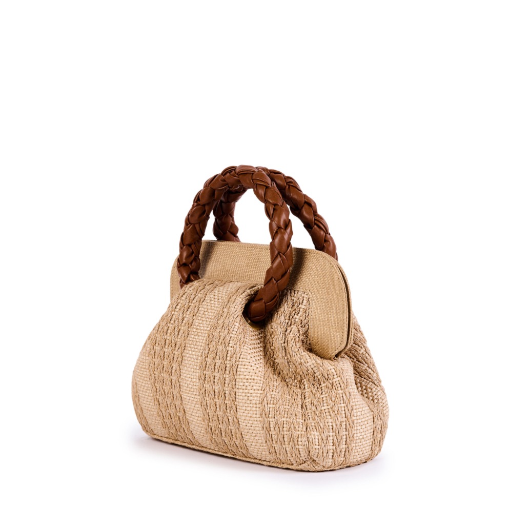 Borsa a mano in rafia naturale jacquard con manici intrecciati a mano, chiusura con calamita, tasca interna e tracolla tubolare.