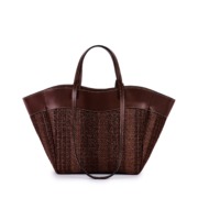 Borsa in rafia jacquard marrone e dettagli in pelle marrone, doppio manico a mano e a spalla con chiusura superiore con zip.