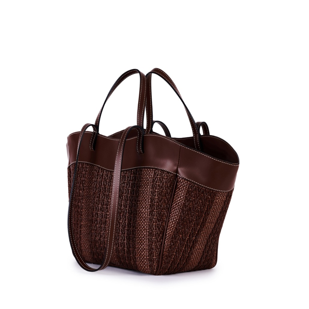Borsa in rafia jacquard marrone e dettagli in pelle marrone