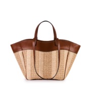 Borsa in rafia jacquard naturale e dettagli in pelle cuoio, doppio manico a mano e a spalla con chiusura superiore con zip.