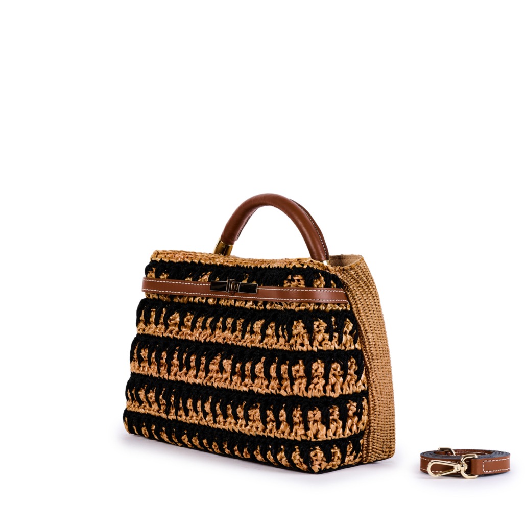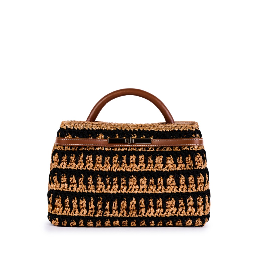 Borsa strutturata in cotone nero e rafia crochet con manico in pelle, chiusura in metallo, tasca interna intramezzata che divide l’interno della borsa in due scomparti e tracolla in pelle.