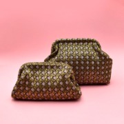 Borsette a mano e con sottile catena oro in tessuto fantasia lavorato effetto la paglia di Vienna con trama laminata oro, fondo rosa tenue