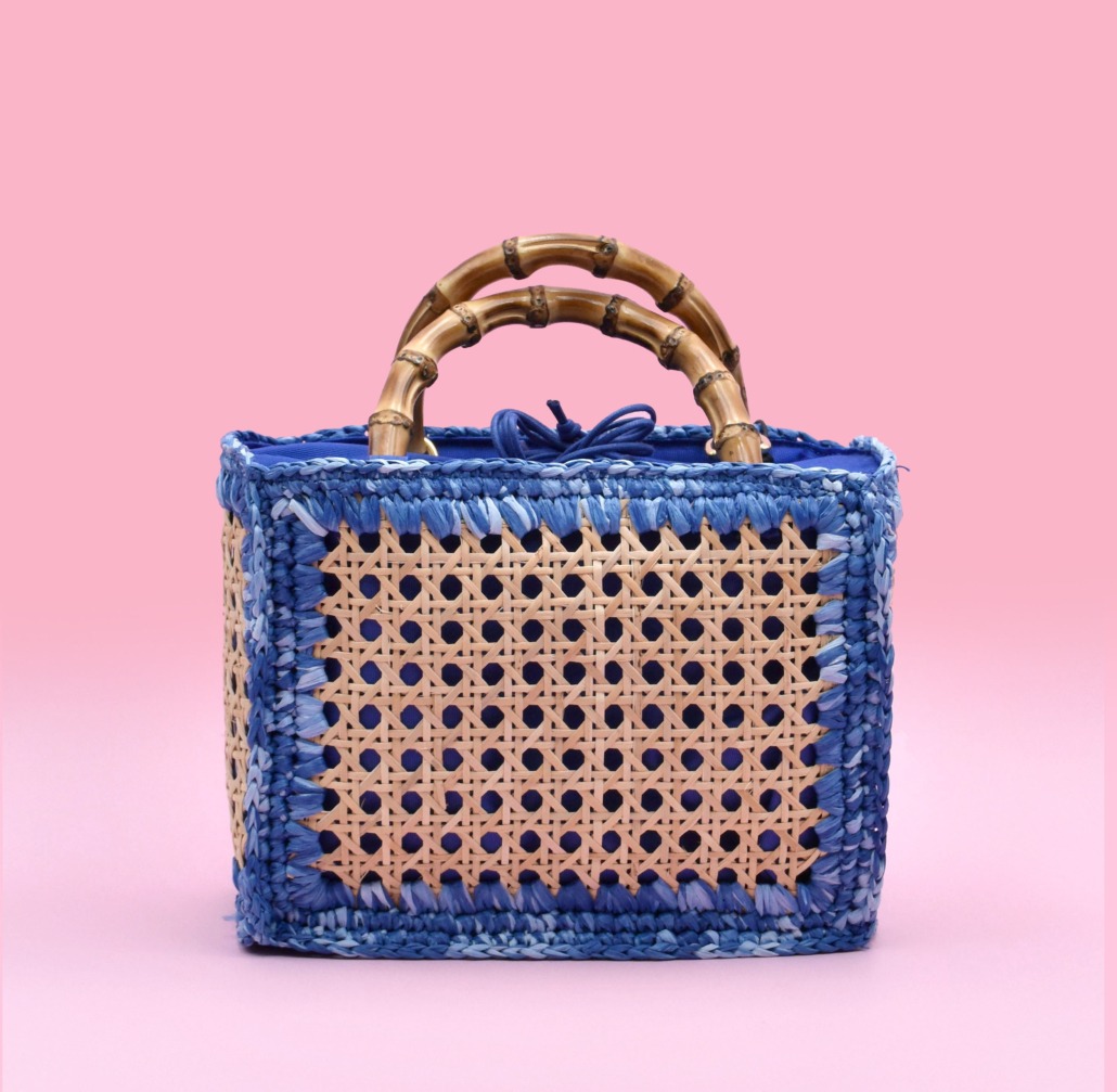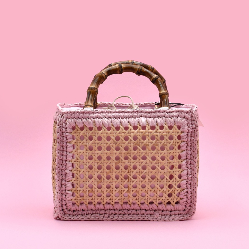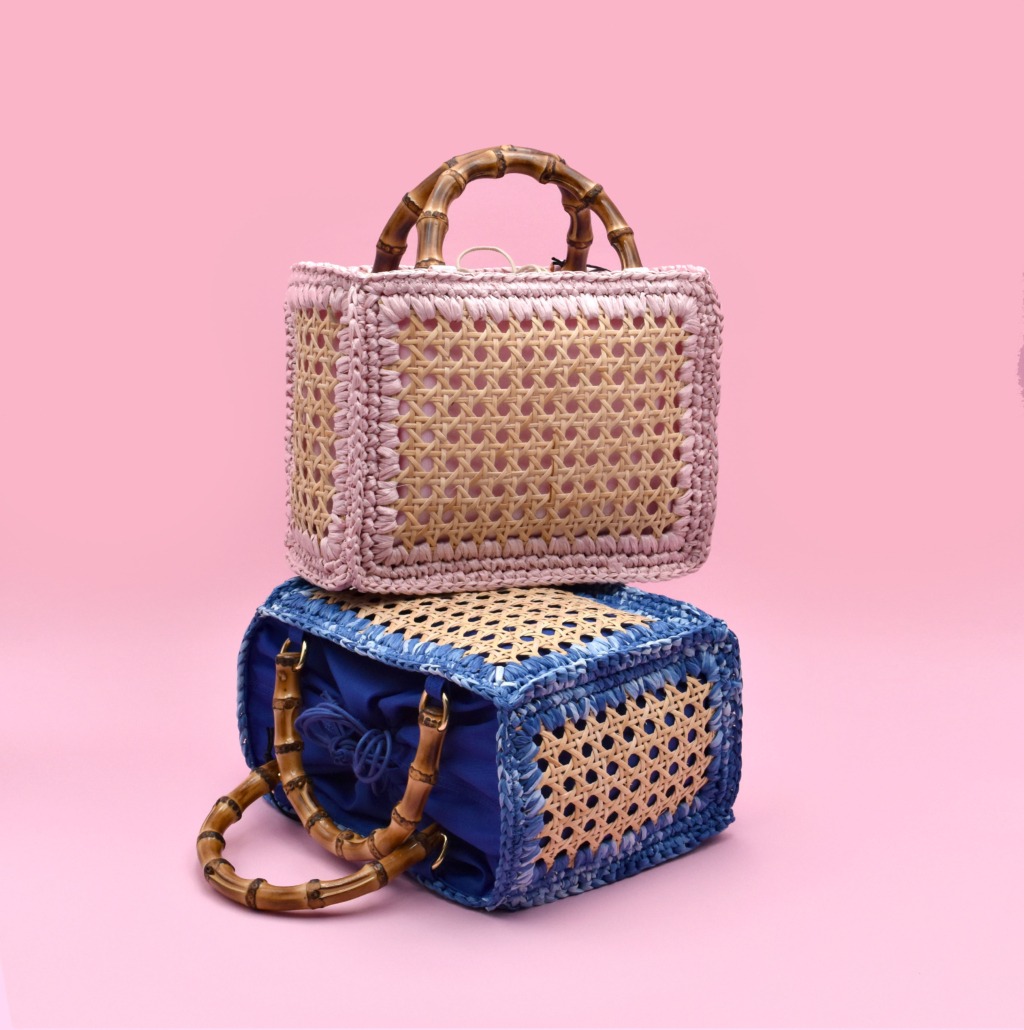 Ricercate borse firmate Caterina Bertini realizzate in paglia di Vienna con dettaglio decoro in rosa confetto e turchese.