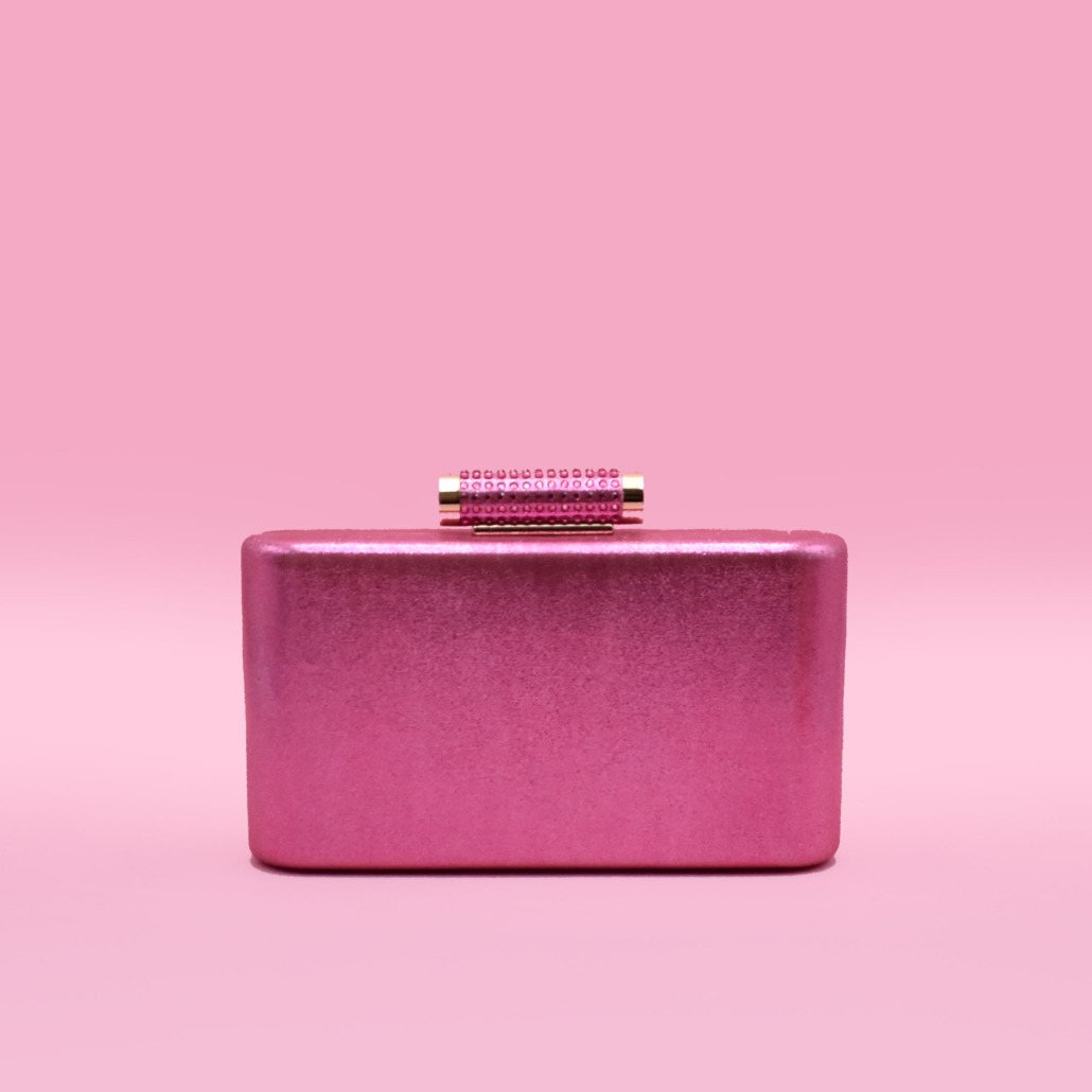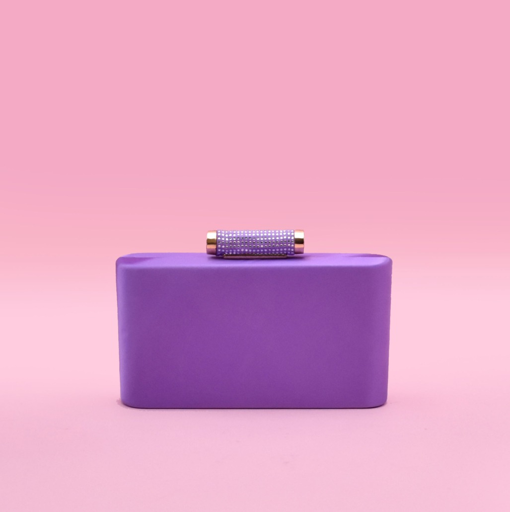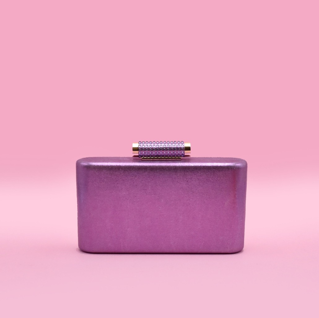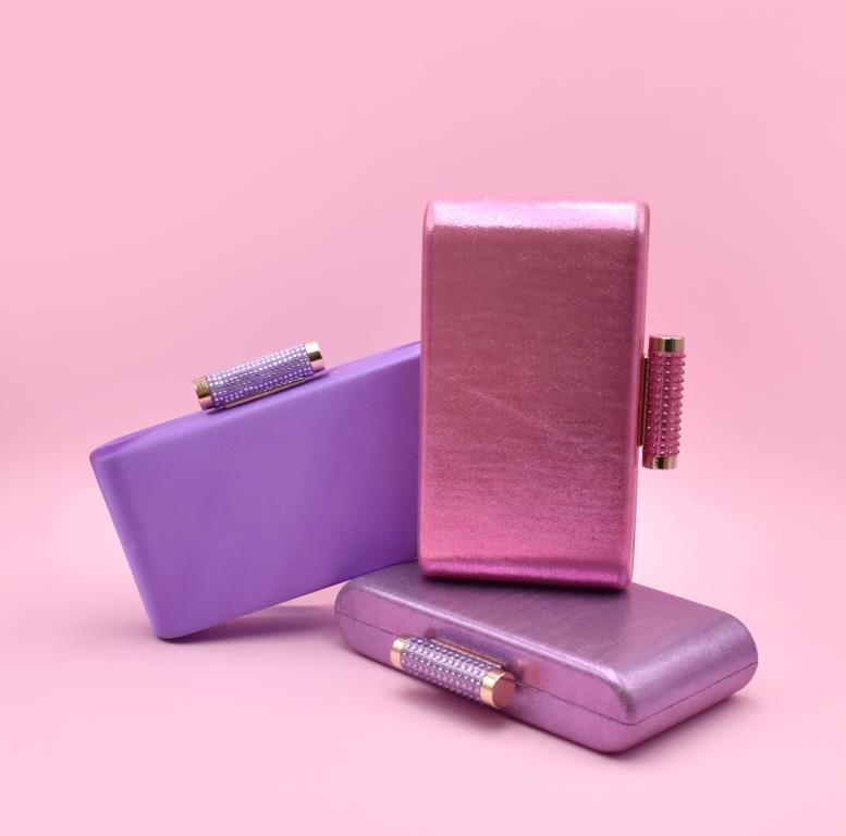 Clutch rigida in tre varianti colore, laminata rosa, laminata glicine e raso viola con chiusura a scatto gioiello e tracolla platino a scomparsa