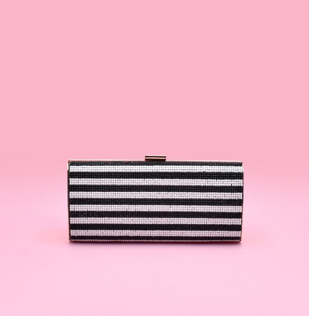 Clutch rigida rettangolare con motivo mosaico rigato bianco e nero.