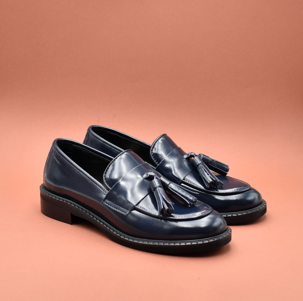 Mocassino in morbida pelle di vitello effetto semilucido Blu petrolio con simpatiche nappine.